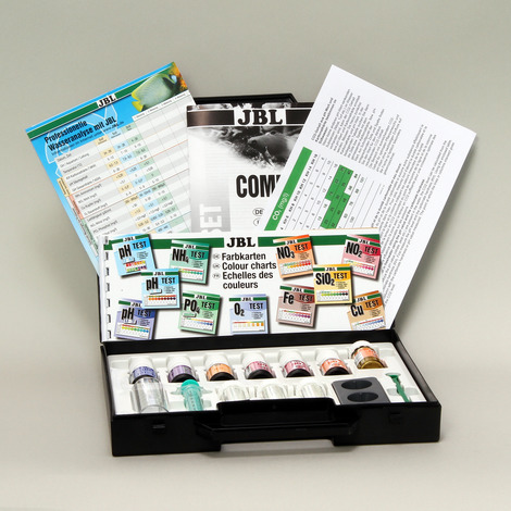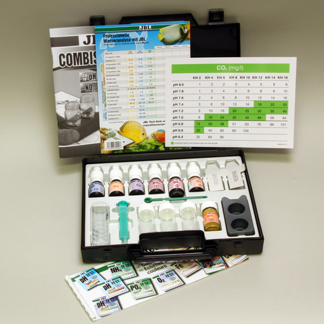 - Lieferumfang: 1 Testkoffer für bepflanzte Aquarien. 5 Reagenzien, 3 Glasküvetten, Spritze, Dosierlöffel, Komparatorblock, Kunststoffküvette, Farbkarten, Protokollblätter, Bedienungsanleitung