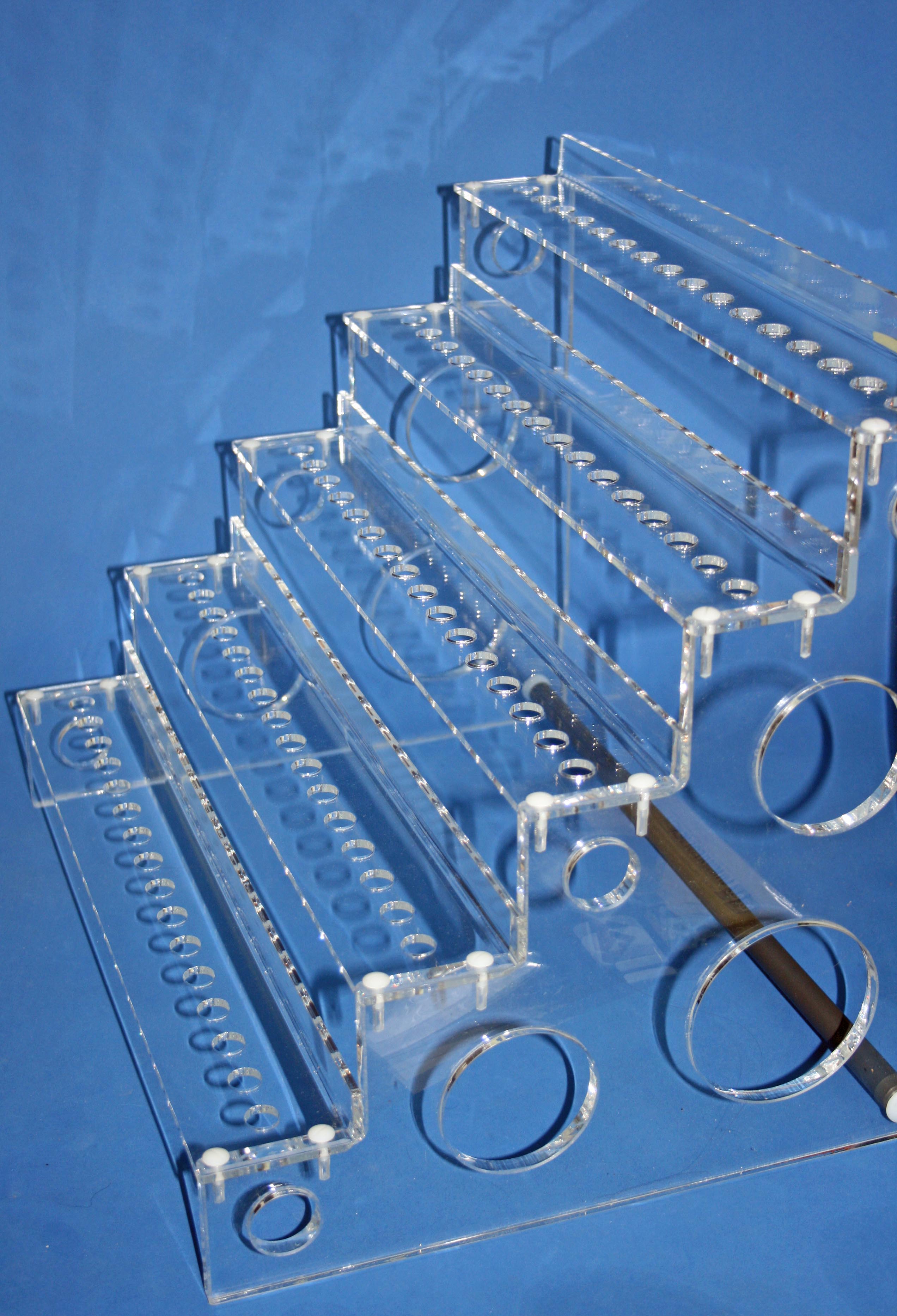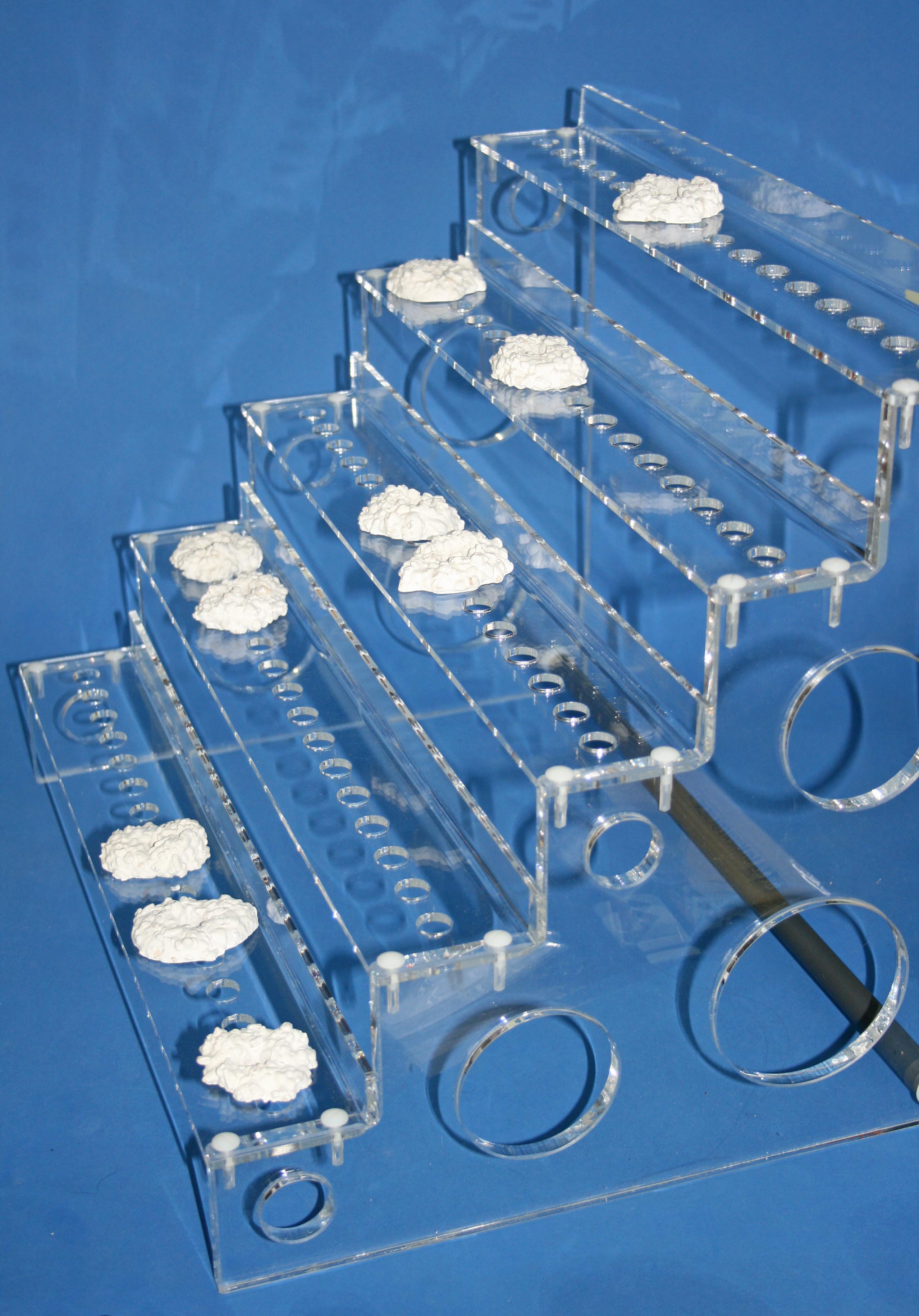 Das Coral Rack L ist zur Aufzucht von Korallenablegern konzipiert. Es können entweder 80 Reefplugs oder normale Ablegersteine verwendet werden. Für die Seitenteile werden 10mm Acrylplatten verwendet. Die Böden werden aus 4mm Acryl geläsert und anschließend gebogen um eine erhöhte Steifigkeit zu erlangen.