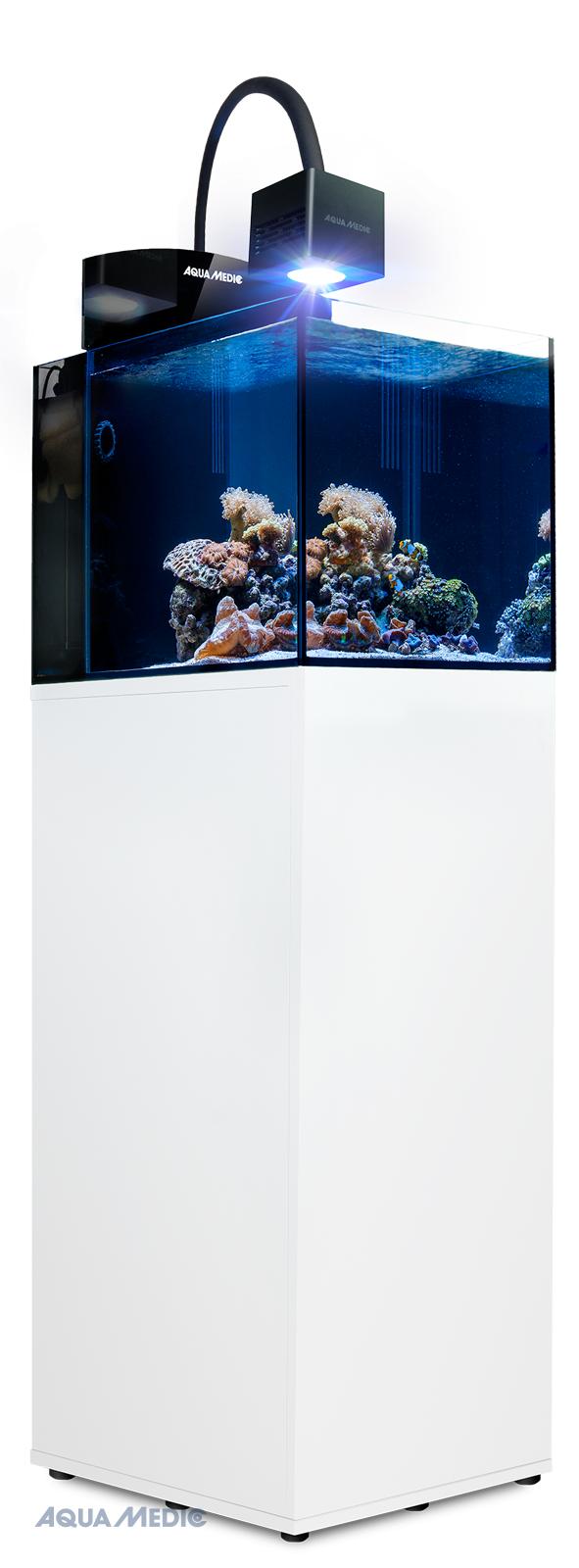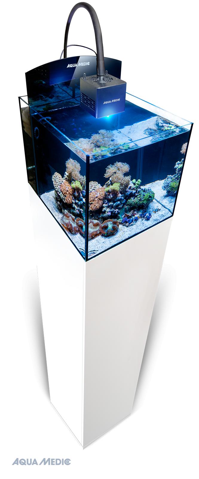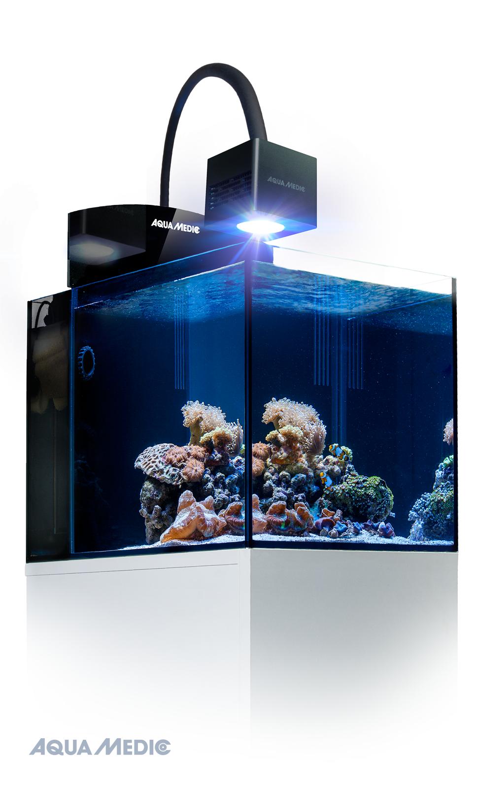 - Beleuchtung: Qube 50 High Power LED-Spot mit ausgewogenem Lichtspektrum. Fünf Lichtfarben mit hoher Energiedichte, speziell abgestimmt für starkes Korallenwachstum (24 V, max. 50 W). Farbe und Lichtmenge sind über zwei Kanäle manuell einstellbar. Integrierter 0 - 10 Volt Anschluss zur Verwendung externer Steuergeräte.