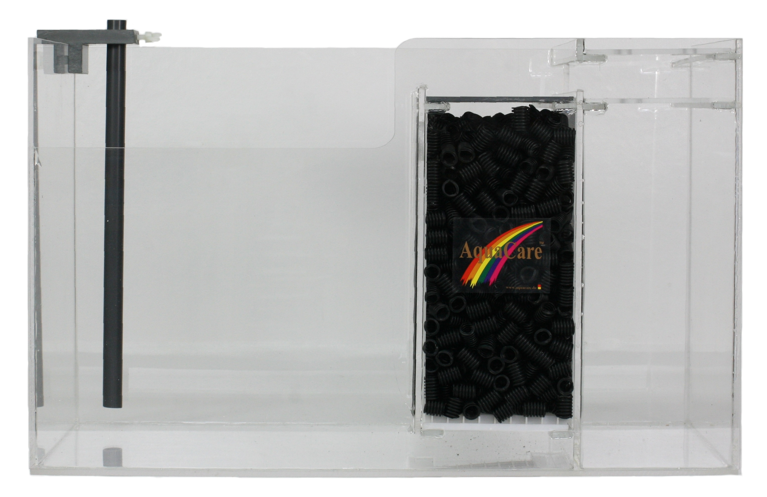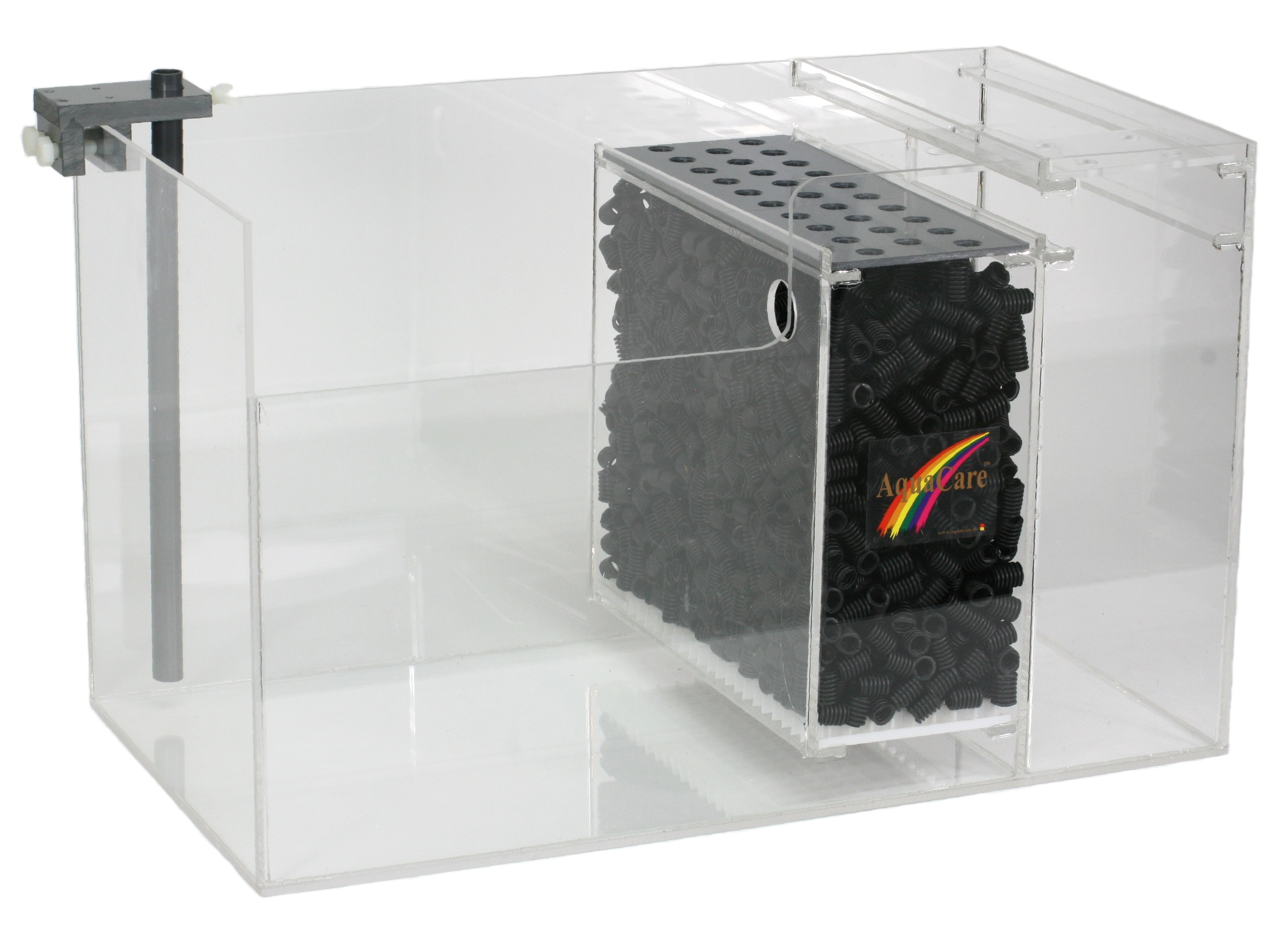 Dieses Filterbecken ist für Meerwasseraquarien bis ca. 300 Litern geeignet. Es besteht aus einer Einlaufkammer, Entgasungsstufe für den Abschäumer und einer Multifunktionskammer.