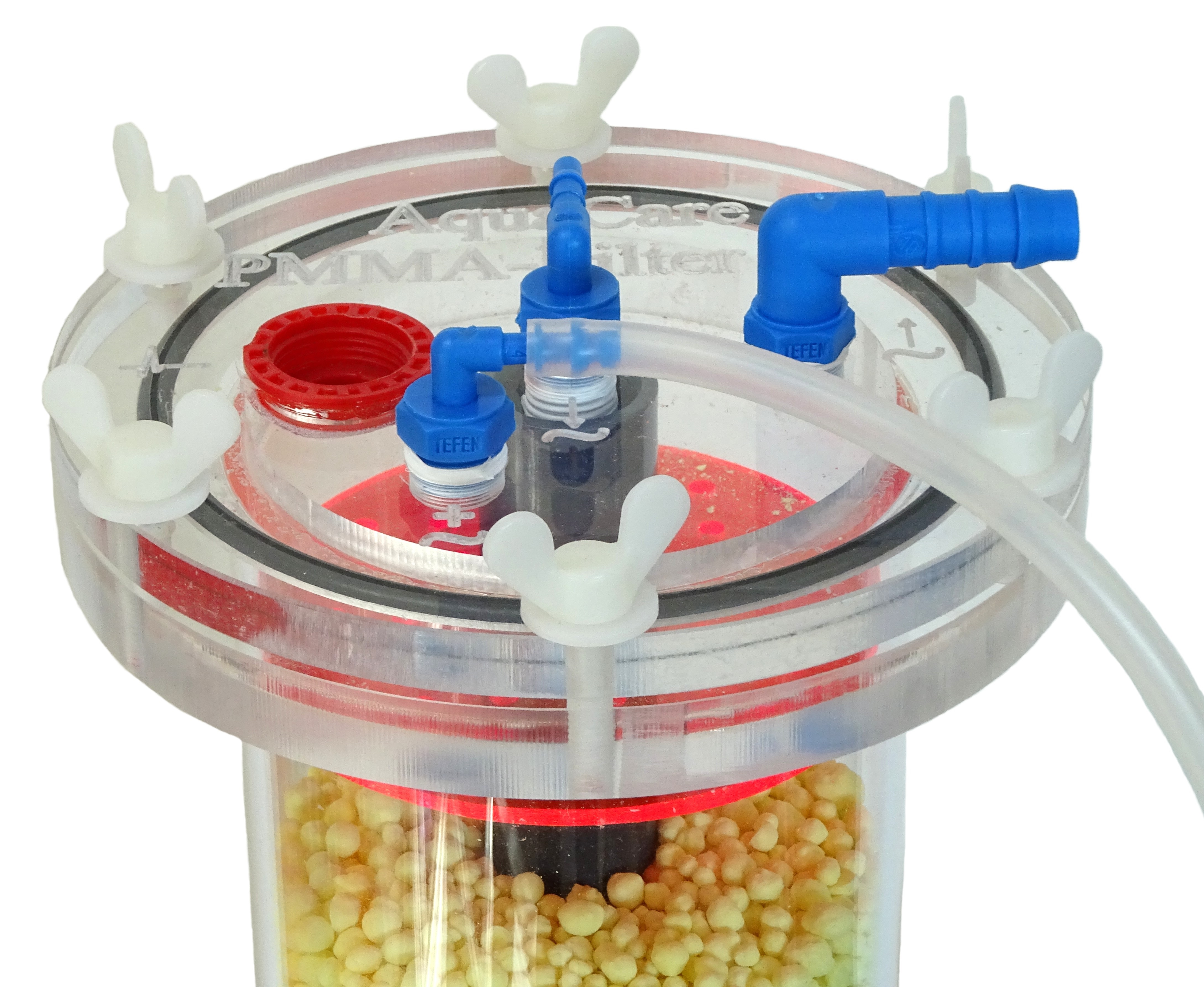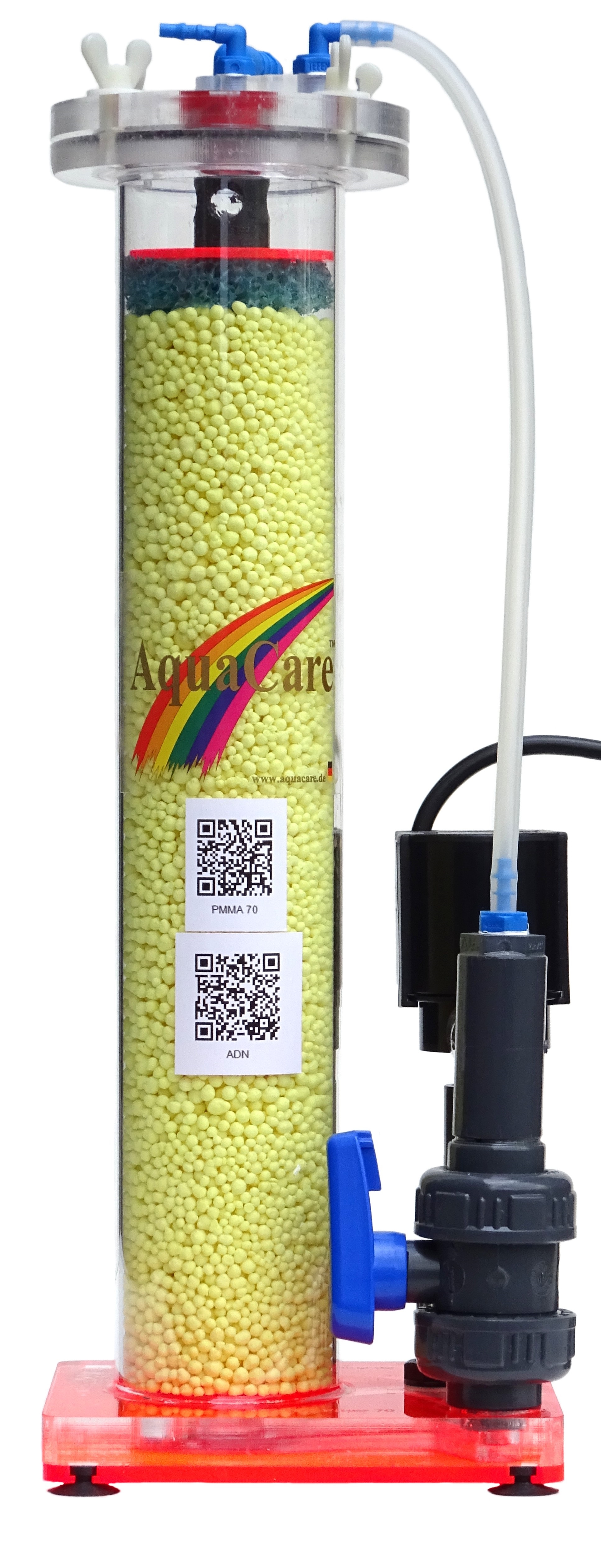 Autotropher Nitratreaktor (Schwefelnitratreaktor) bestehend aus transparentem Gehäuse auf stabiler Bodenplatte; Schwefelgranulat getrennt durch herausnehmbare Siebe; Kreislaufpumpe mit doppelt keramischer Lagerung zur Erzeugung einer kräftigen Kreislaufströmung, die die Reaktionsrate erhöht und die Verstopfungsgefahr vermindert.