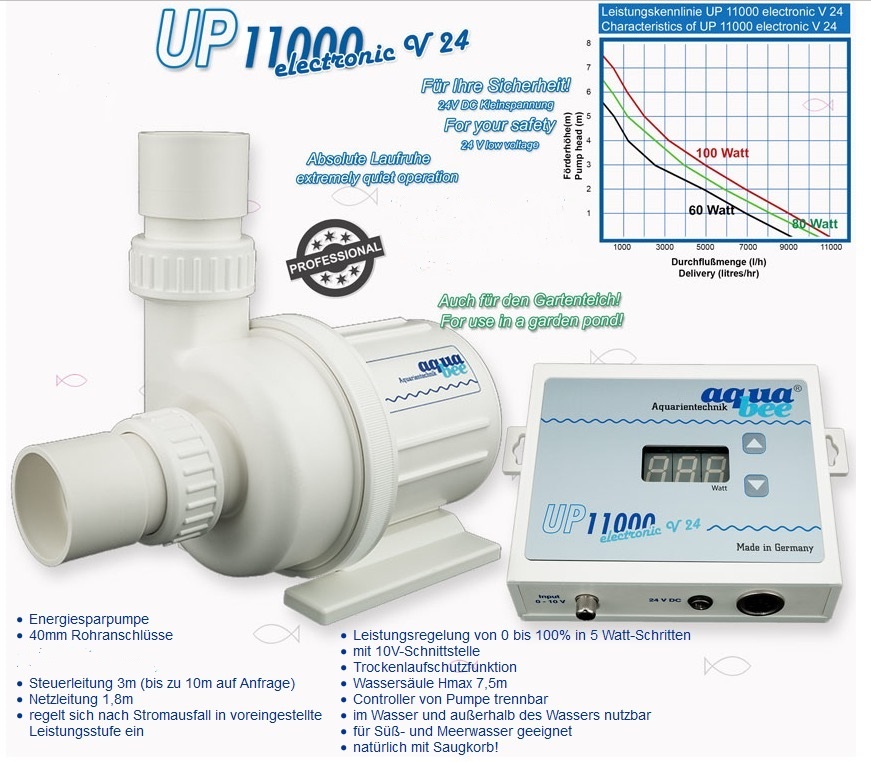 Die UP 11000 electronic V24 ist eine neue Förderpumpe, die für höchste Anforderungen in der Meer und Süßwasseraquaristik entwickelt wurde. Durch ihren modernen 24Volt brushless DC Motor besitzt die Pumpeeine absolute Laufruhe. Die Keramiklager bewirken eine enorm hohe Lebensdauer. Das stufenlos drehbare Kreiselgehäuse ermöglicht ein individuelles wegführen der Verrohrung und eine werkzeuglose Demontage und Montage der Pumpe. Der Controller ist von der Pumpe trennbar. Die 24 Volt Schutzkleinspannung garantiert eine absolute Sicherheit im Aquarium. Über die 10 Volt Schnittstelle kann die Pumpe über einen gängigen Aquariencomputer angesteuert werden.