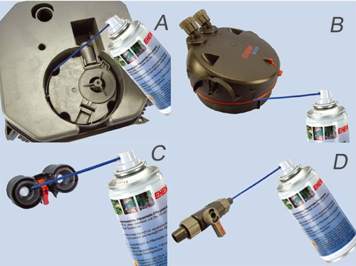 Bewegliche Teile, die regelmäßig Aquariumwasser ausgesetzt sind, neigen dazu, nach einiger Zeit schwergängig zu werden oder gar komplett festzusetzen. Einfach das Spray auf das betroffene Teil sprühen, und innerhalb kürzester Zeit ist es wieder beweglich. Besonders zu empfehlen – auch um die Elastizität zu erhalten – für Ventile, Absperrhähne, Schlauchadapter, Dichtungen u.v.m.