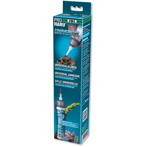 Aquarien-, Terrarien- und Teichfreunde benötigen für die verschiedensten Anwendungen Kleber, der vor allem ungiftig für Tiere und Pflanzen ist. Dafür wurde JBL ProHaru universal und rapid entwickelt. Wer Dekorationsmaterialien miteinander verkleben möchte, muss darauf achten, dass er vorhandene Biofilme auf den Materialien so gut wie möglich entfernt, da Biofilme (rutschige Oberfläche durch Bakterien) eine dauerhafte Verklebung verhindern. Trockene, vorher unbenutze Materialien weisen kein problematischen Biofilme auf